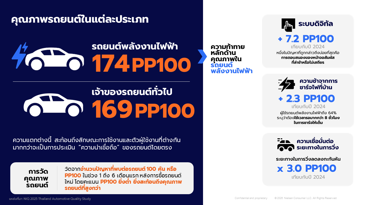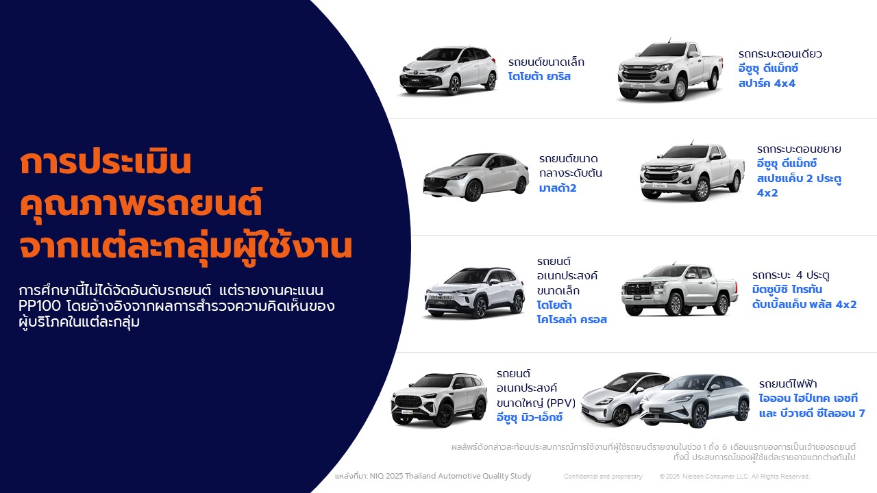 NIQ 2025 Thailand Automotive Quality Study เป็นการศึกษาเกี่ยวกับคุณภาพรถยนต์ จัดทำขึ้นที่ NIQ ประเทศไทย โดยมีวัตถุประสงค์เพื่อประเมินปัญหาที่ผู้บริโภคเผชิญในช่วง 6 เดือนแรกของการเป็นเจ้าของรถยนต์ โดยเก็บข้อมูลระหว่างช่วงเดือนมิถุนายนถึงพฤศจิกายน 2568 มีผู้เข้าร่วมทั้งหมด 3,479 คน ซึ่งเป็นผู้ที่ซื้อรถใหม่ระหว่างเดือนธันวาคม 2567 ถึงตุลาคม 2568 การวิเคราะห์นี้ครอบคลุมรถยนต์ 60 รุ่น รวมทั้งรถยนต์พลังงานไฟฟ้า (BEV) และรถยนต์ที่ไม่ใช่พลังงานไฟฟ้า ในกลุ่มรถเก๋ง รถเอนกประสงค์ และรถกระบะ ซึ่งวัดจากจำนวนปัญหาที่พบต่อรถยนต์ 100 คัน หรือ PP100 โดยคะแนน PP100 ยิ่งต่ำ ยิ่งสะท้อนถึงคุณภาพรถยนต์ที่สูงกว่า