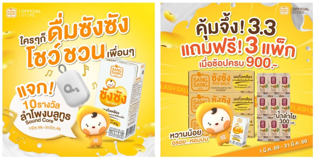 สายตุนห้ามพลาด! มีนาคมนี้ “ซังซัง” นมถั่วเหลืองหวานน้อย อร่อยหอมมัน จัดโปรโมชัน 3.3 คุ้มจึ้งแบบตะโกน เพียงช้อปซังซังครบ 900 บาท รับฟรีทันที “มามีมี่ น้ำลำไย” ขนาด 300 มิลลิลิตร จำนวน 3 แพ็ก ดื่มคู่กันได้ทั้งความอร่อยและความสดชื่นในคราวเดียว โปรโมชันตั้งแต่วันนี้ถึง 31 มีนาคม 2569 เท่านั้น! รีบพุ่งตัวไปช้อปได้เลยที่ www.lactasoyshop.com/product-category/sangsang
