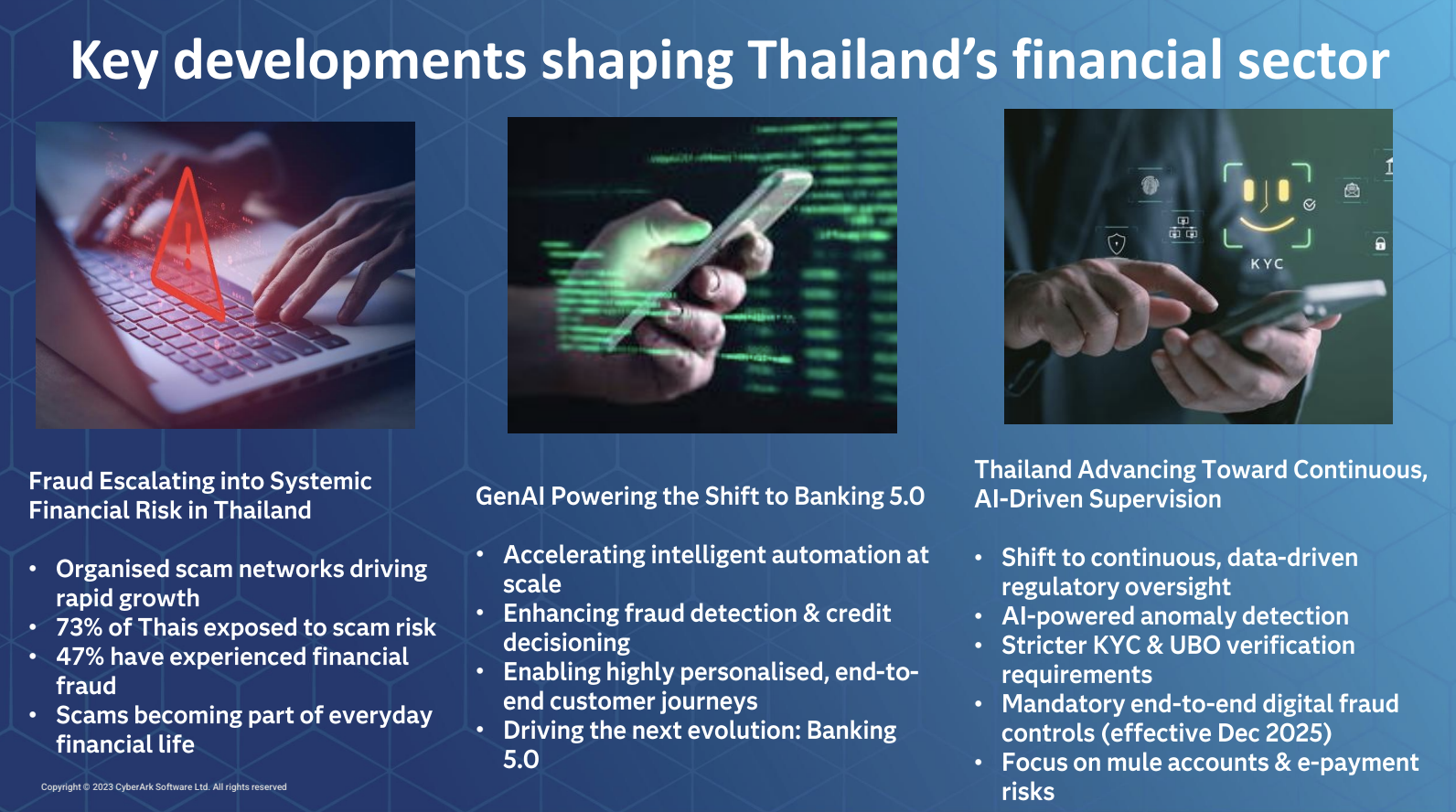 คุณชอว์ พิน คัค หัวหน้าฝ่ายบริหารความเสี่ยงและที่ปรึกษาด้านลูกค้า ประจำภูมิภาคอาเซียน ประจำภูมิภาคอาเซียน กล่าวเพิ่มเติมว่า ประเทศไทยกำลังอยู่ในช่วงจุดเปลี่ยนสำคัญ โดย AI กำลังเร่งให้เกิดนวัตกรรมในภาคธนาคารและฟินเทคอย่างรวดเร็ว ขณะเดียวกันระดับความเสี่ยงก็ขยายตัวเพิ่มขึ้นในอัตราที่ใกล้เคียงกัน”