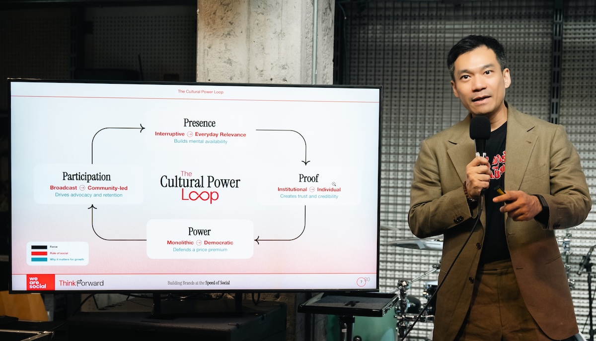 คุณปัฐวีร์ อภิวัชรเจริญสิน รองผู้อำนวยการฝ่ายกลยุทธ์ We Are Social Thailand กล่าวว่า “เราเลิกคุยเรื่อง Reach กันนานแล้ว เพราะยอดวิวที่ไม่มีใครจำได้ มันไม่มีค่า โจทย์วันนี้คือจะทำอย่างไร ให้แบรนด์เข้าไปอยู่ใน DNA ได้แบบไม่ขัดตา ซึ่ง We Are Social อยากแบ่งปันผ่านแนวคิด The Cultural Power Loop หรือ 4 ท่าไม้ตายในการคุมเกมยุคใหม่ ที่ไม่ใช่แค่ทฤษฎีในกระดาษ ประกอบด้วย