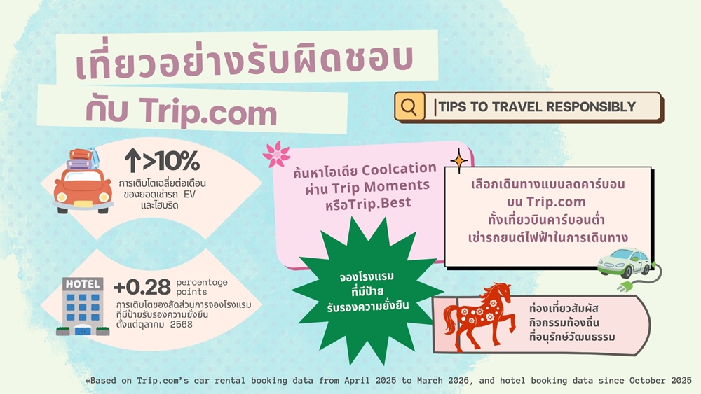 Trip.com Group ยังคงมุ่งมั่นในการขยายตัวเลือกด้านการท่องเที่ยวอย่างยั่งยืนในผลิตภัณฑ์การท่องเที่ยวทุกประเภท เพื่อช่วยให้นักท่องเที่ยวตัดสินใจได้อย่างรอบคอบ โดยข้อมูลล่าสุดจาก Trip.com พบว่า ยอดจองการเช่ารถยนต์ไฟฟ้าและรถยนต์ไฮบริดบนแพลตฟอร์มเติบโตเฉลี่ยกว่า 10% ต่อเดือนตลอดปีที่ผ่านมา [6] ขณะที่ยอดจองที่พักที่ได้รับการเครื่องหมายรับรองด้านความยั่งยืนก็เพิ่มขึ้นอย่างต่อเนื่องนับตั้งแต่เดือนตุลาคมปีที่แล้ว [7]