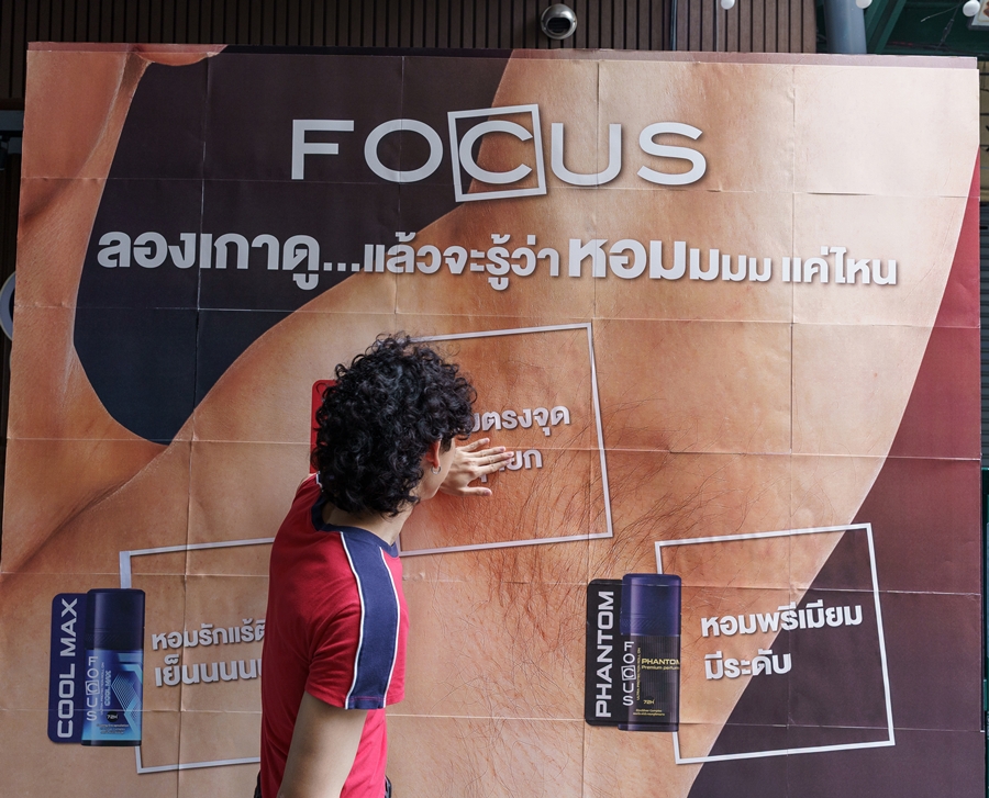 จุดที่สอง – แบ็คดรอปยักษ์ภาพวงแขนผู้ชายแบบเสมือนจริง พร้อมให้ลองเกาเพื่อทดลองพิสูจน์ 3 กลิ่น ยอดนิยมจากโฟกัส ได้แก่