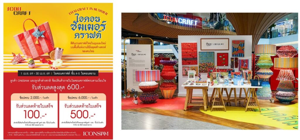 พิเศษสำหรับสมาชิก ONESIAM และลูกค้าชาวต่างชาติ ช็อปสนุกกับแคมเปญ “ไอคอนซัมเมอร์คราฟต์ THAI CRAFT IN SUMMER” รับส่วนลดสูงสุด 600 บาท โดยเมื่อสินค้าภายในร้านไอคอนคราฟต์ครบ 2,000 บาทขึ้นไป/ใบเสร็จ รับคูปองส่วนลดท้ายใบเสร็จทันที 100 บาท (สำหรับการซื้อครั้งถัดไป ขั้นต่ำ 200 บาท/ใบเสร็จ) และช็อปครบ 6,000 บาทขึ้นไป/ใบเสร็จ รับคูปองส่วนลดท้ายใบเสร็จไปเลย 500 บาท (สำหรับการซื้อครั้งถัดไป ขั้นต่ำ 1,000 บาท/ใบเสร็จ) สิทธิ์มีจำนวนจำกัด
