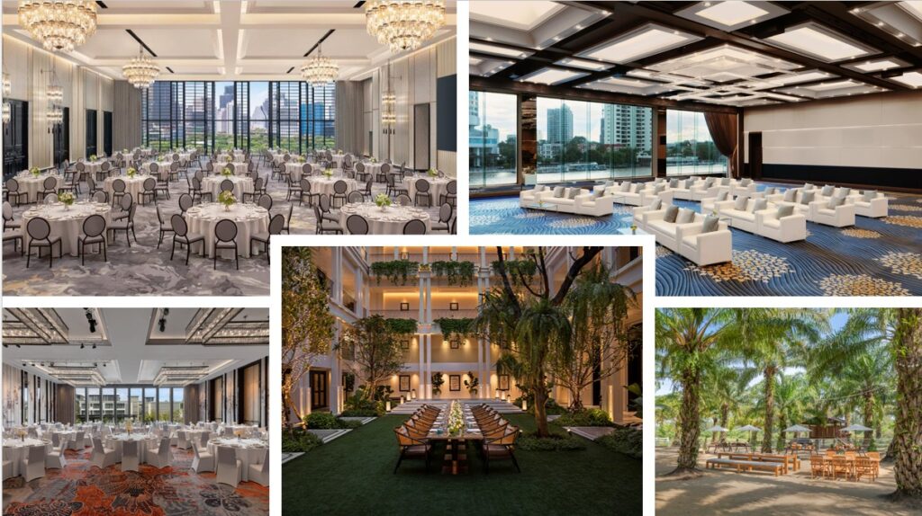 เรเนซองส์ กรุงเทพฯ ราชประสงค์ (Renaissance Bangkok Ratchaprasong) ซึ่งตั้งอยู่ใจกลางย่านราชประสงค์ นำเสนอพื้นที่จัดงานที่เดินทางสะดวก เหมาะสำหรับการประชุมระดับองค์กรและระดับภูมิภาค ขณะที่ เดอะ ริทซ์‑คาร์ลตัน, กรุงเทพฯ (The Ritz Carlton Bangkok) ยกระดับอีเวนต์ระดับไฮเอนด์ด้วยสถานที่จัดงานสุดหรู 9 แห่ง รวมถึงห้องบอลรูมที่สามารถชื่นชมทัศนียภาพของสวนลุมพินี