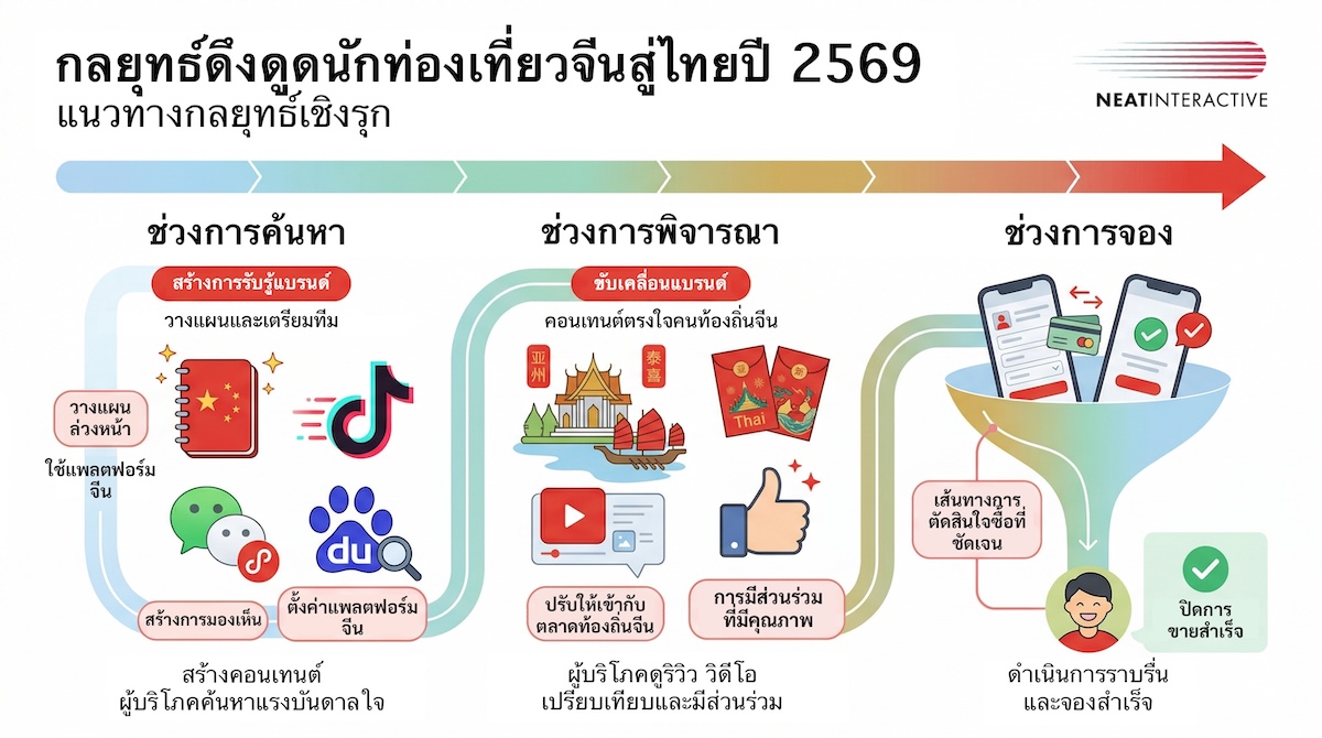 ภายใต้บริบทนี้ การตลาดดิจิทัลกำลังกลายเป็นตัวแปรสำคัญที่สร้างความแตกต่างให้กับแบรนด์ ซึ่ง Neat Interactive ได้แนะนำเทรนด์สำคัญที่แบรนด์ไทยควรจับตา เพื่อกำหนดทิศทางการดึงดูดนักท่องเที่ยวจีนในปีนี้ ดังนี้