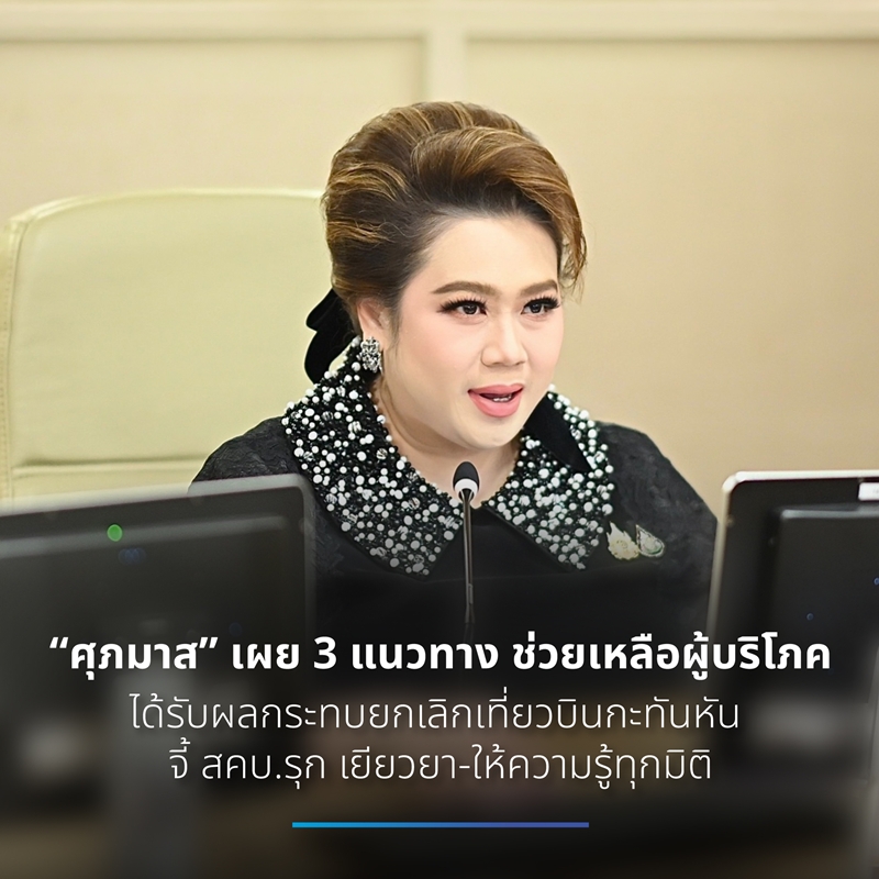 นางสาวศุภมาส อิศรภักดี รัฐมนตรีประจำสำนักนายกรัฐมนตรี ในฐานะกำกับดูแลสำนักงานคณะกรรมการคุ้มครองผู้บริโภค (สคบ.) ได้สั่งการให้ สคบ. เร่งติดตามและแก้ไขปัญหากรณีสายการบินหลายแห่งทยอยประกาศยกเลิกเที่ยวบิน ซึ่งส่งผลกระทบต่อผู้บริโภคในวงกว้าง ทั้งด้านแผนการเดินทางและค่าใช้จ่ายที่เกี่ยวข้อง เช่น ค่าที่พัก ค่าทัวร์ และค่าใช้จ่ายอื่นที่ไม่สามารถเรียกคืนได้ ประกอบกับข้อจำกัดของกฎหมายในบางกรณีที่ผู้โดยสารอาจไม่ได้รับค่าชดเชย สร้างความกังวลและความเดือดร้อนให้แก่ประชาชนจำนวนมาก