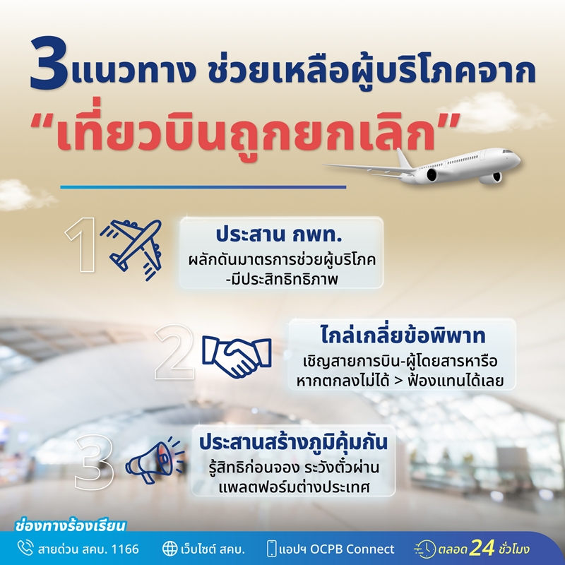“การยกเลิกเที่ยวบินกะทันหันส่งผลกระทบต่อผู้บริโภคเป็นวงกว้าง ไม่เพียงแต่ค่าโดยสารเครื่องบิน แต่ยังรวมถึงการจองที่พัก การเช่ารถ การจองทริปท่องเที่ยว และค่าใช้จ่ายอื่นที่ได้วางแผนล่วงหน้าไว้ ทำให้ประชาชนต้องรับภาระความเสียหายจำนวนมาก ขณะนี้ สคบ. ได้ประสานหน่วยงานที่เกี่ยวข้อง ทั้งสำนักงานการบินพลเรือนแห่งประเทศไทย สมาคมผู้ให้บริการสายการบิน และผู้ให้บริการสายการบิน เพื่อเร่งกำหนดแนวทางและมาตรการช่วยเหลือผู้บริโภคที่ได้รับผลกระทบจากการใช้บริการสายการบินอย่างเร่งด่วน หากประชาชนได้รับความเดือดร้อน หรือไม่ได้รับความเป็นธรรมจากสายการบินในกรณีต่างๆ สามารถขอคำปรึกษาได้ที่สายด่วน สคบ. 1166 หรือผ่านเว็บไซต์ สคบ. และแอปพลิเคชัน OCPB Connect ตลอด 24 ชั่วโมง” นางสาวศุภมาสกล่าว