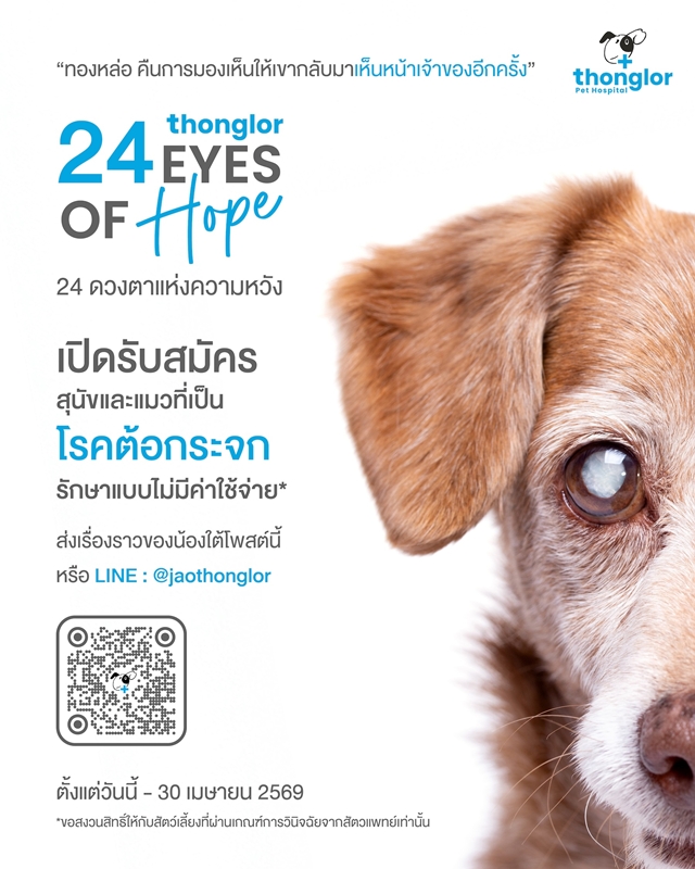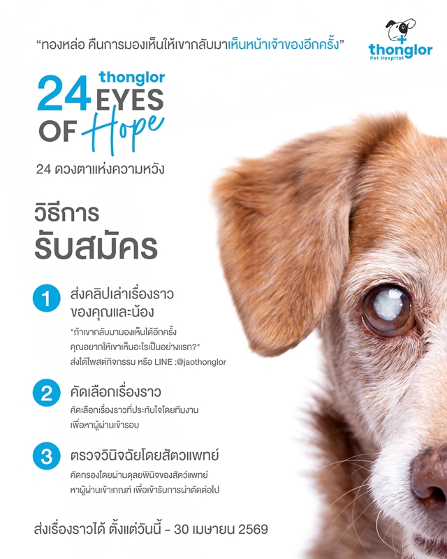 “สัตว์เลี้ยงไม่เคยลืมเจ้าของ แต่วันหนึ่งพวกเขาอาจมองไม่เห็นเราอีกต่อไป” จากความจริง ที่สร้างความสะเทือนใจให้กับคนรักสัตว์ สู่ก้าวสำคัญในการตอบแทนสังคมของ โรงพยาบาลสัตว์ทองหล่อ (Thonglor Pet Hospital) ล่าสุดได้ประกาศเดินหน้า CSR แคมเปญสุดยิ่งใหญ่แห่งปี ภายใต้ชื่อ “24 EYES OF HOPE” (24 ดวงตาแห่งความหวัง) โครงการผ่าตัดสลายต้อกระจกเพื่อช่วยเหลือ สุนัขและแมวที่ประสบปัญหา ด้านการมองเห็น เปิดรับสมัครเคสสัตว์เลี้ยงที่มีข้อจำกัดด้านงบประมาณ และขาดโอกาสเข้าถึงการรักษา เข้าร่วมโครงการแล้วตั้งแต่วันนี้