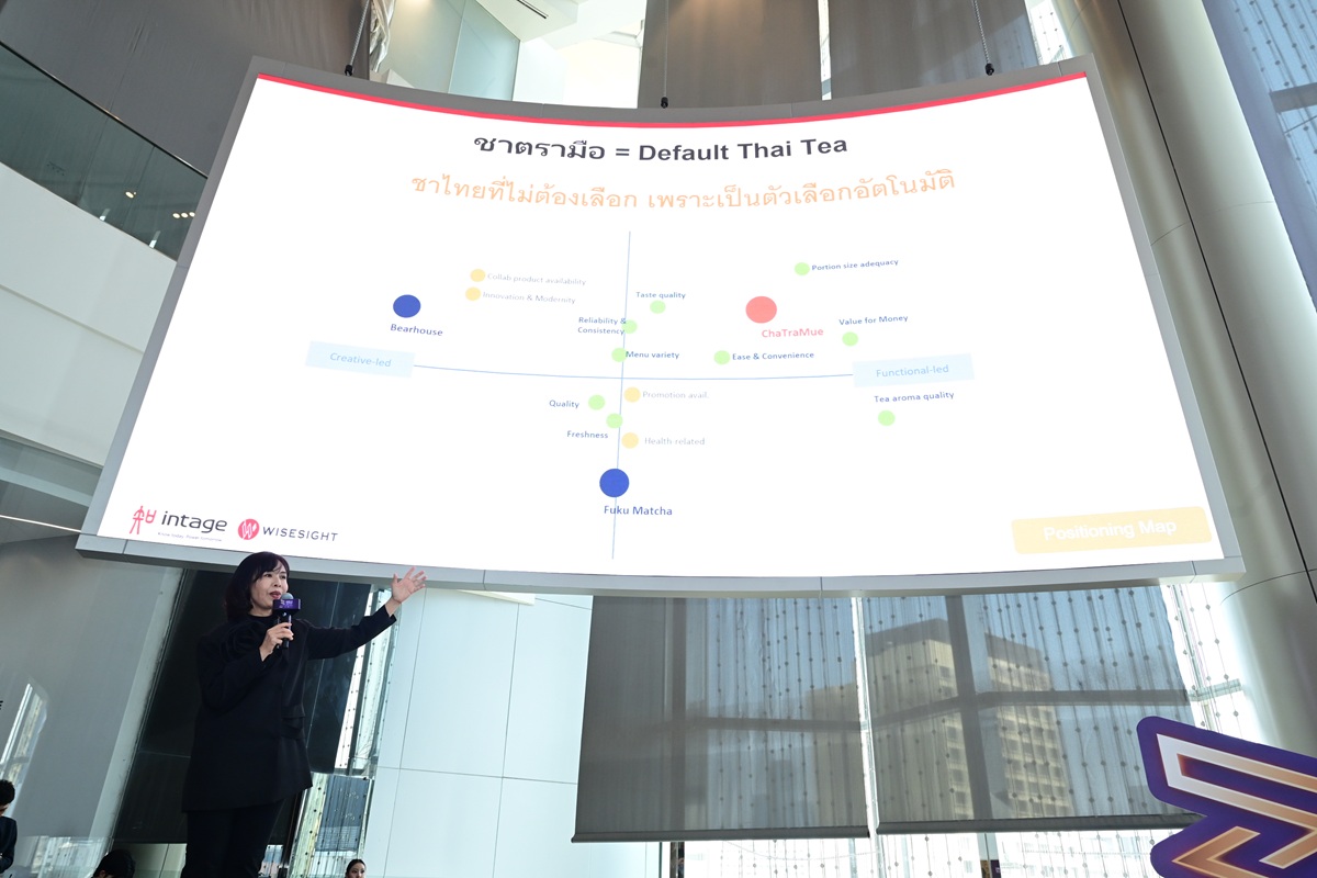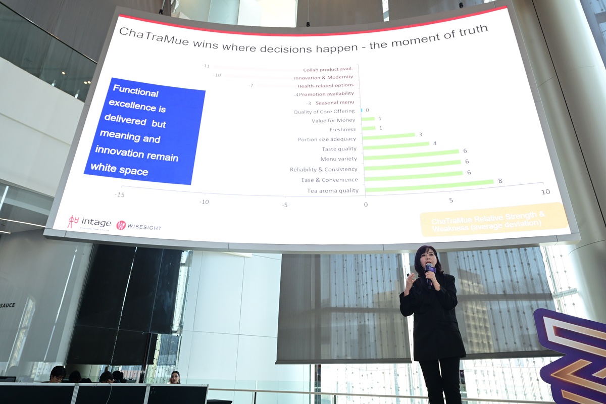 – สิ่งที่ทำให้ชาตรามือแตกต่าง คือ Pride และ Social proof โดยถือเป็น Soft power ของไทย เห็นได้จากสาขาในต่างประเทศที่มีผู้บริโภคต่อคิวยาวเพื่อรอซื้อ เป็นเครื่องดื่มสร้างไวรัลจาก ROSÉ BLACKPINK เลือกทานในคอนเสิร์ตที่ประเทศไทย ทำให้ “ชาตรามือ” ได้คะแนน Brand Personality สูงสุดถึง 72% ขณะที่แบรนด์ร้านชาอื่นๆ ได้คะแนน 8-23%