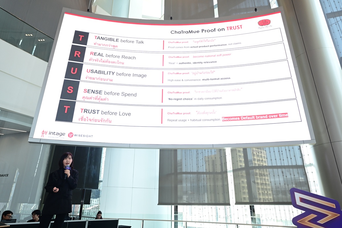 – ชาตรามือ ไม่ได้ตะโกนเสียงดังแต่มี Tangible Proof ที่คนบอกต่อสิ่งที่ promise ไว้กับผู้บริโภค การออกสินค้าใหม่ที่พิสูจน์ได้ว่ารสชาติดี อร่อยด้วยสูตรต่างๆ แม้ Gen Z ชอบฟังสตอรี่แบรนด์ แต่ไม่ได้เชื่อ เพราะสินค้าต้องมีสิ่งที่พิสูจน์คุณสมบัติว่าทำได้จริงจึงตัดสินใจซื้อ