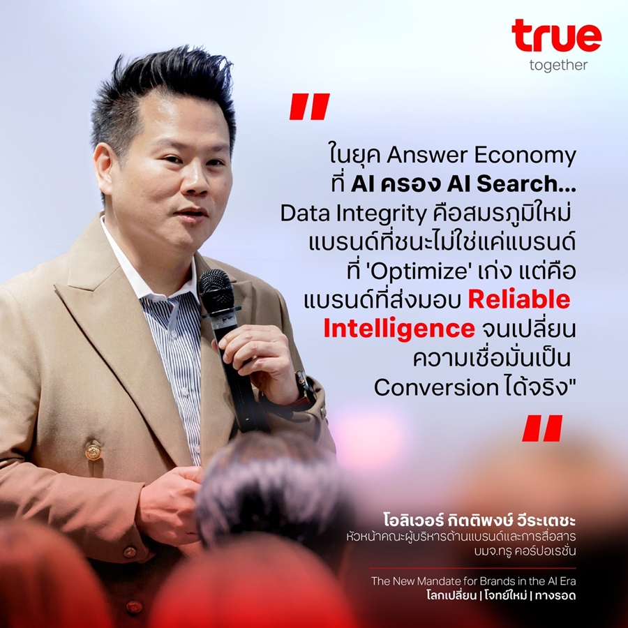 ในโลกดิจิทัลที่ AI กำลัง Re-shape พฤติกรรมผู้บริโภคจากการเข้าถึงข้อมูลด้วย Search Engine Optimization (SEO) สู่ Generative Engine Optimization (GEO) ที่ไม่เพียง “ค้นหา” แต่ต้องนำไปสู่ “การถามเพื่อให้ได้คำตอบที่ดีที่สุด” ทำให้ “การสนทนากับ AI” กลายเป็นจุดเริ่มต้นของการตัดสินใจมากขึ้น ในยุค Answer Economy บนเวที “The New Mandate for Brands in the AI Era” จัดโดย ABM Connect ร่วมกับ Brand Buffet และสมาคมโฆษณาแห่งประเทศไทย คุณโอลิเวอร์ กิตติพงษ์ วีระเตชะ หัวหน้าคณะผู้บริหารด้านแบรนด์และการสื่อสาร บมจ.ทรู คอร์ปอเรชั่น ได้ร่วมแบ่งปันมุมมองในหัวข้อ “The Authority Bandwagon: Why Brands Must Become the Source of Truth” ชี้ให้เห็นว่า ธุรกิจไทยที่จะก้าวข้ามความท้าทายและอยู่ในใจผู้บริโภคได้นั้น ต้องยกระดับบทบาทจาก “ผู้สื่อสาร” ไปสู่การเป็น “Source of Truth” หรือแหล่งที่ให้ข้อมูลได้ครบถ้วน ถูกต้อง และน่าเชื่อถือ เพื่อให้ AI เลือกใช้อ้างอิงและนำไปสู่คำตอบที่ดีที่สุดที่ถูกเลือกโดยผู้บริโภคในท้ายที่สุด