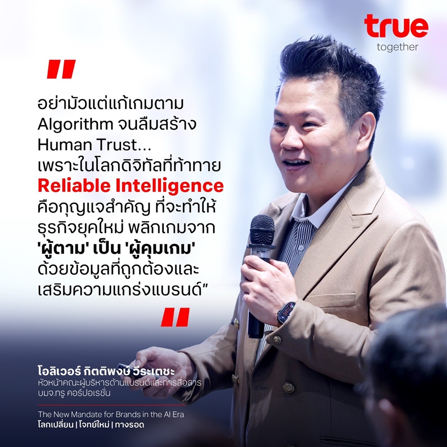 คุณโอลิเวอร์ อธิบายว่า “โลกกำลังก้าวเข้าสู่ยุคของ Algorithmic Brand Building อย่างเต็มรูปแบบ การสร้างแบรนด์ไม่ได้ขับเคลื่อนด้วย Brand Guideline อย่างเดียวอีกต่อไป แต่ต้องอาศัยพลังของดาต้าเพื่อเข้าใจลูกค้าในระดับที่ลึกและแม่นยำยิ่งขึ้น วันนี้ ทรู ดูแลลูกค้ากว่า 50 ล้านราย สามารถวิเคราะห์และแตกย่อยพฤติกรรมสู่การสร้างความเข้าใจเชิงลึกในระดับ micro-segmentation สะท้อนว่าการตลาดยุคใหม่ ไม่ใช่เพียงแค่การเข้าถึง แต่คือ “การเข้าใจให้ลึกซึ้งกว่าเดิม” ผ่านการเชื่อมโยงข้อมูลเข้ากับบริบทของผู้คน
