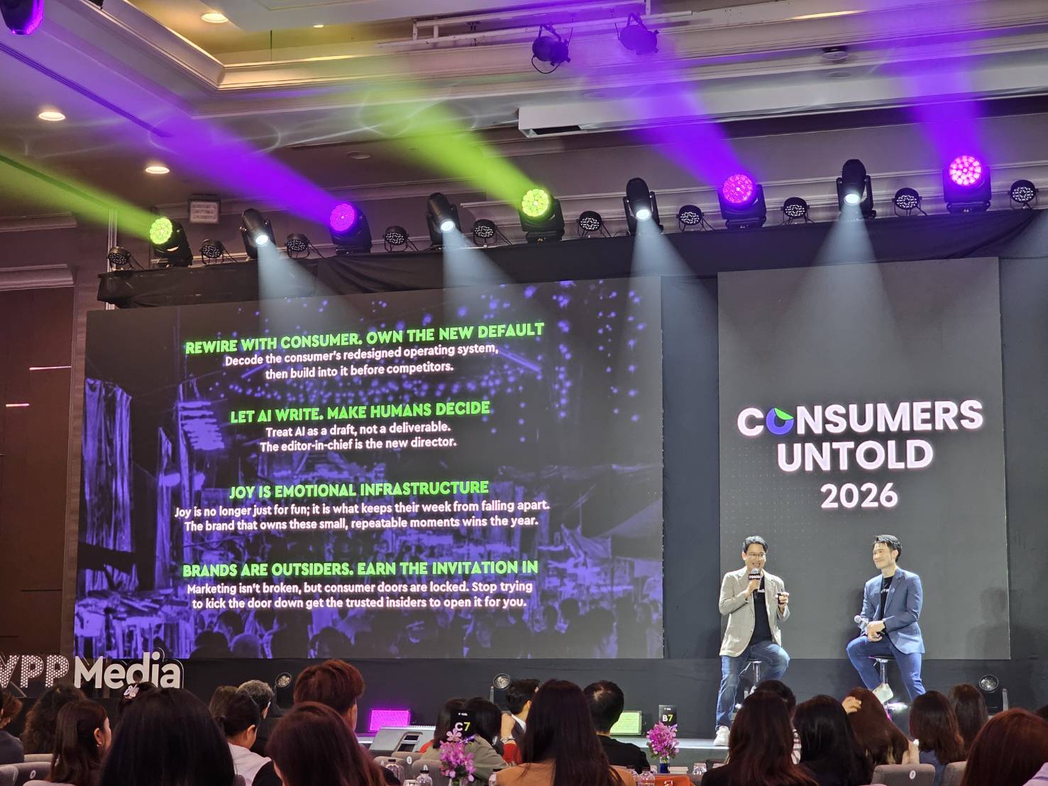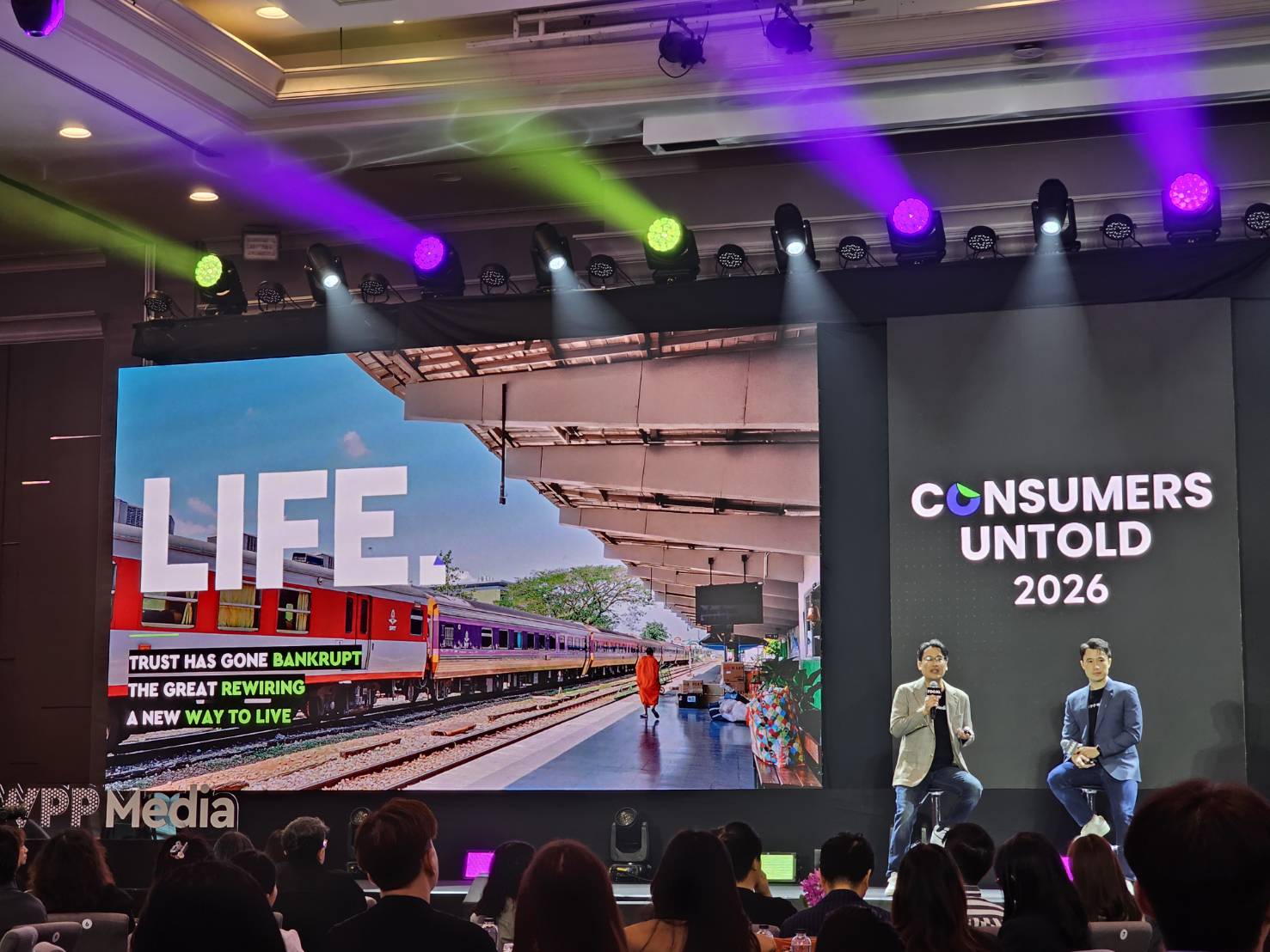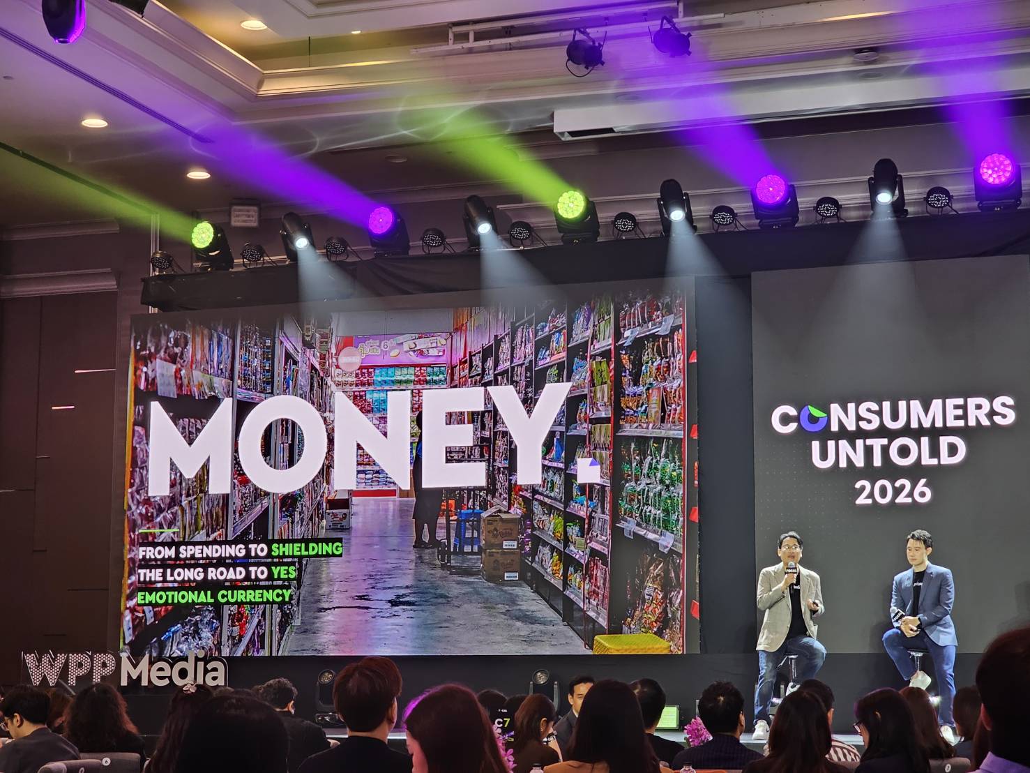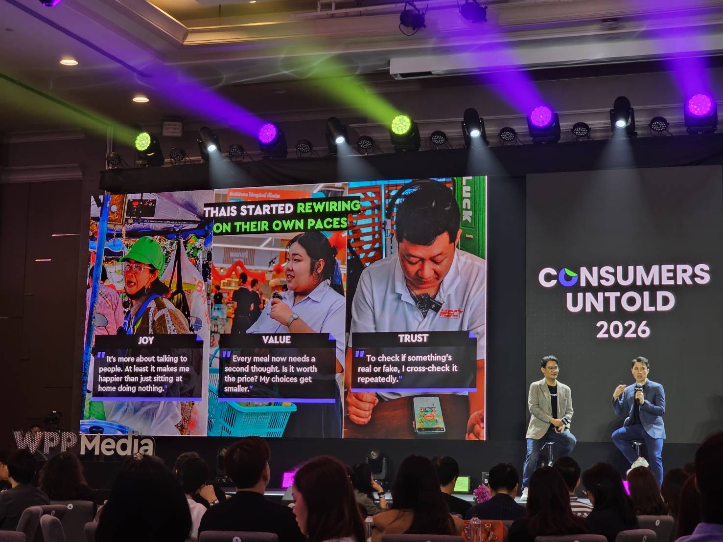 คุณณัฐวีร์ ณีว มาวิจักขณ์ ผู้บริหารแผนกการตลาด และคุณแพน จรุงธนาภิบาล ผู้อำนวยการแผนกการตลาด ดับบลิวพีพี มีเดีย (ประเทศไทย) สรุผลวิจัย Consumers Untold 2026 ที่ศึกษากลุ่มตัวอย่างกว่า 2,400 คน และสัมภาษณ์เชิงลึก 220 คน ในพื้นที่ 22 จังหวัดทั่วประเทศไทย รวมถึงเวียงจันทน์ สปป.ลาว เพื่อศึกษาพฤติกรรมการใช้ชีวิต ทัศนคติ การเลือกที่จับจ่ายซื้อของ และการเสพสื่อ ดังนี้