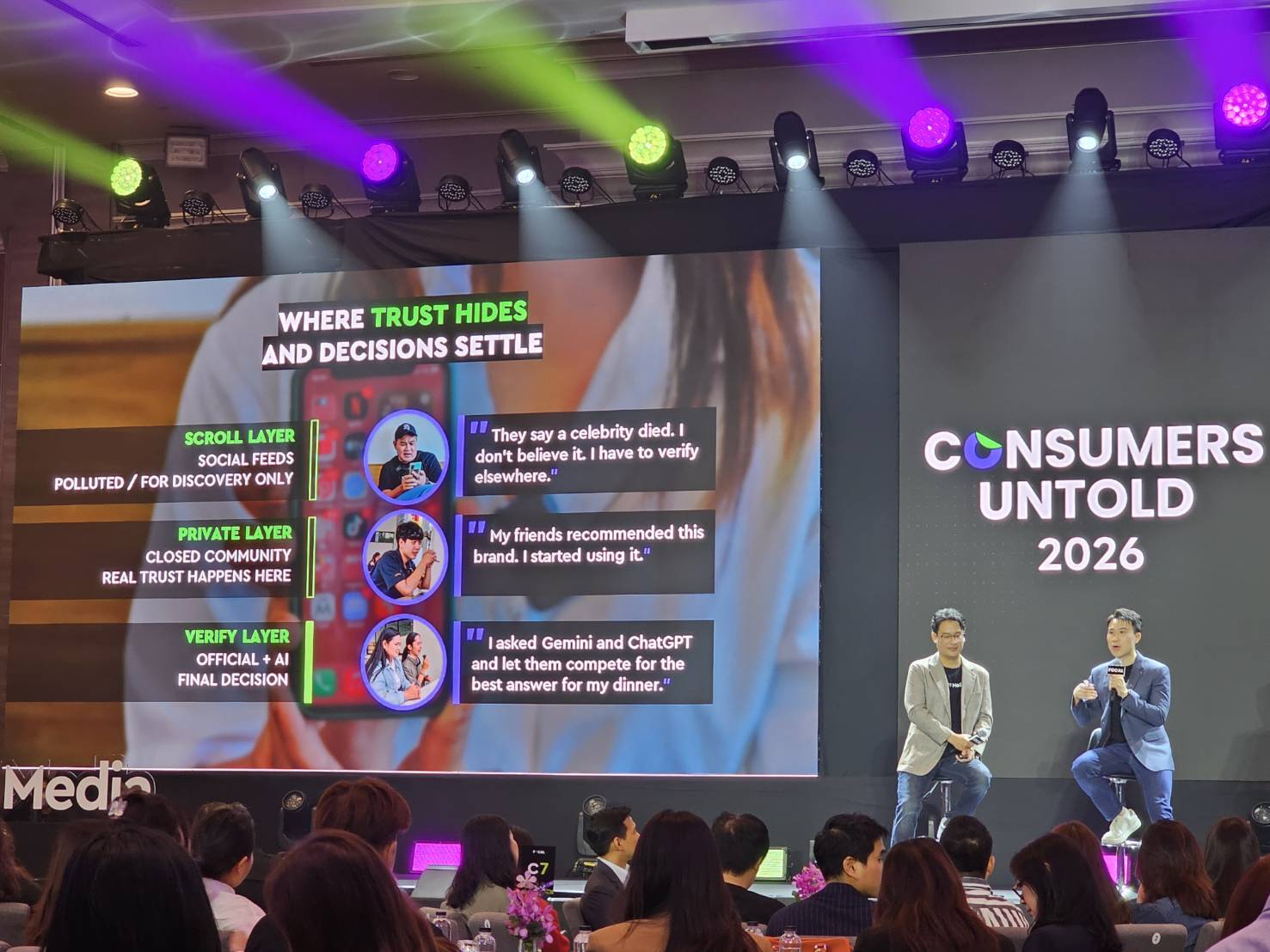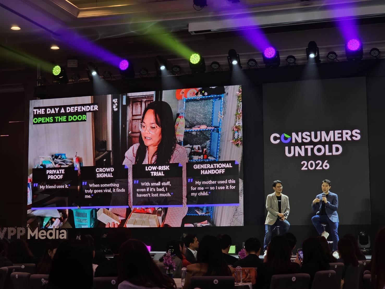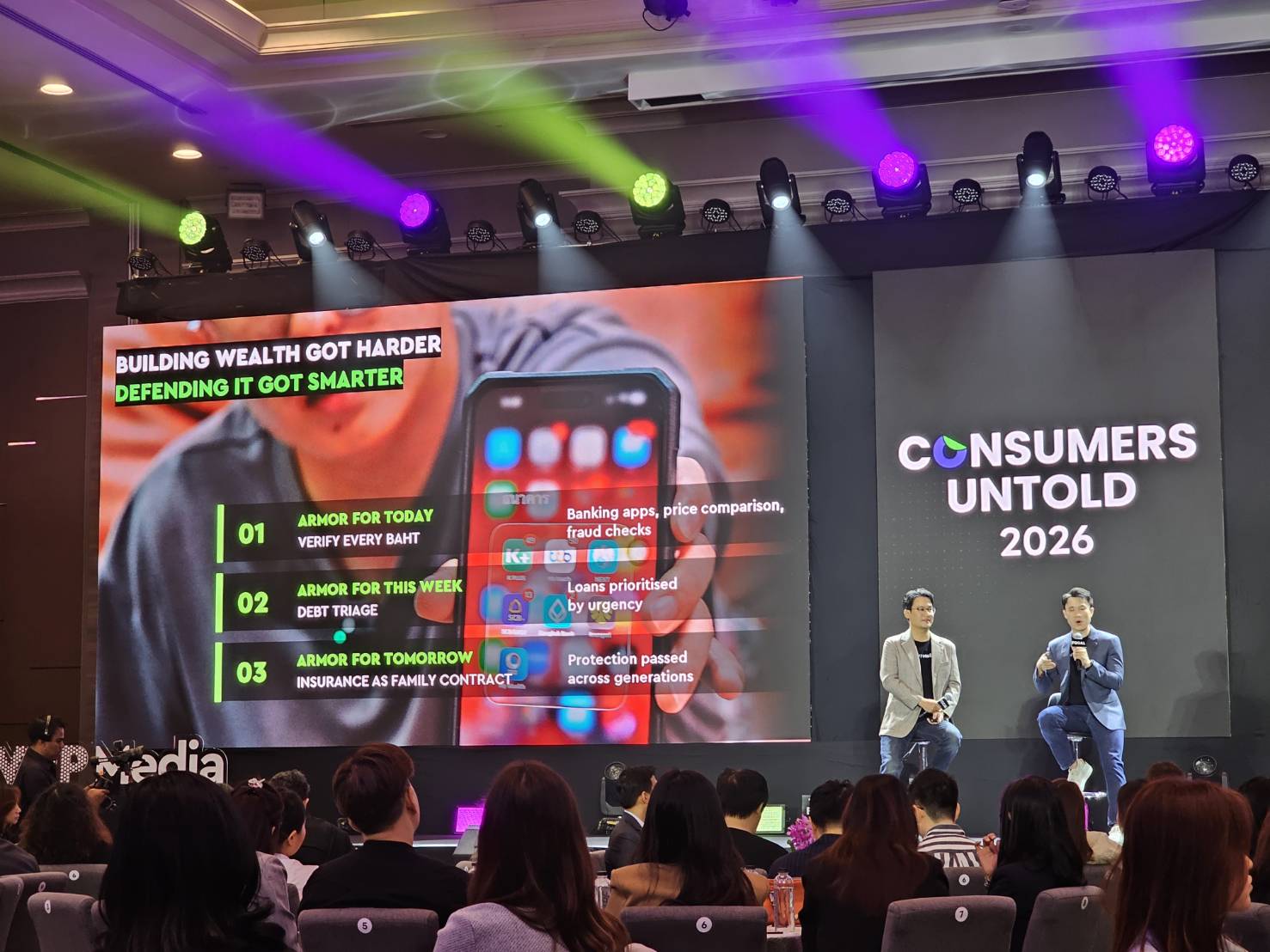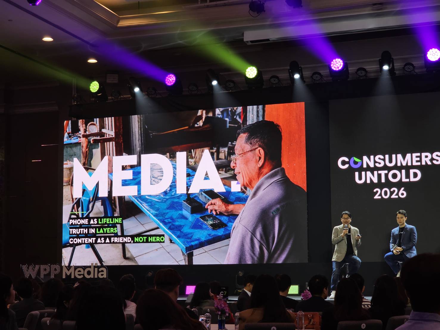 คุณณัฐวีร์ ณีว มาวิจักขณ์ ผู้บริหารแผนกการตลาด และคุณแพน จรุงธนาภิบาล ผู้อำนวยการแผนกการตลาด ดับบลิวพีพี มีเดีย (ประเทศไทย) สรุผลวิจัย Consumers Untold 2026 ที่ศึกษากลุ่มตัวอย่างกว่า 2,400 คน และสัมภาษณ์เชิงลึก 220 คน ในพื้นที่ 22 จังหวัดทั่วประเทศไทย รวมถึงเวียงจันทน์ สปป.ลาว เพื่อศึกษาพฤติกรรมการใช้ชีวิต ทัศนคติ การเลือกที่จับจ่ายซื้อของ และการเสพสื่อ ดังนี้