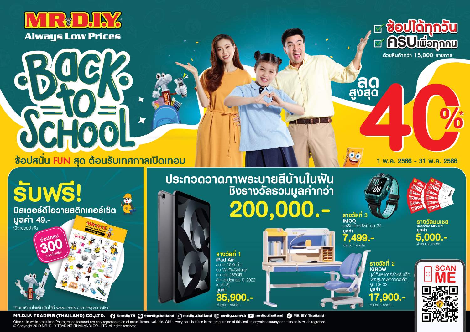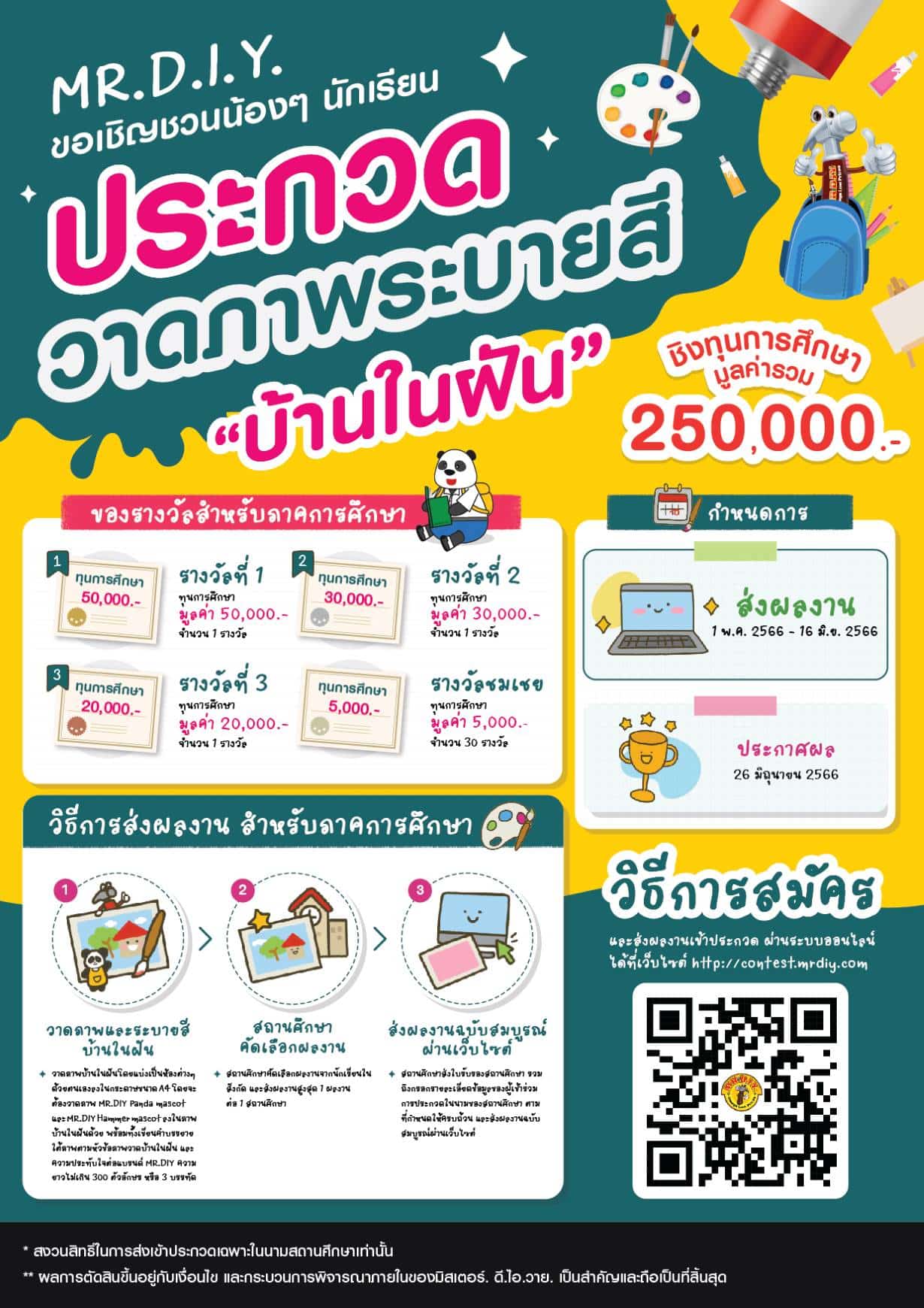 นอกจากการคัดสรรไอเทมฮิตคุณภาพดีมาให้น้อง ๆ ได้ช้อปรับเปิดเทอมแล้ว MR. D.I.Y. ยังชวนเด็กไทยอายุ 6-12 ปี มาต่อยอดความสนุกไปอีกขั้น พร้อมโชว์พลังไอเดียสร้างสรรค์ในแบบของตนเอง ผ่านกิจกรรมประกวดวาดภาพระบายสีบ้านในฝัน ชิงของรางวัลและทุนการศึกษา มูลค่ารวมกว่า 450,000 บาท โดยแบ่งการแข่งขันออกเป็น 2 ประเภท ดังนี้